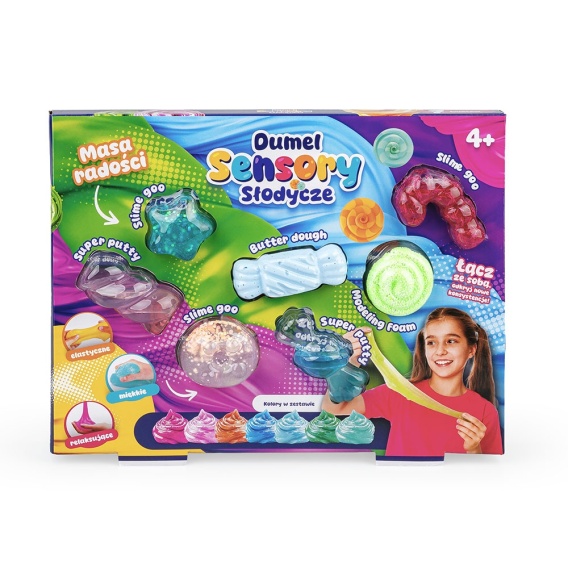 Słodziakowa zabawa w ugniatanie i rozciąganie! W cukierkowych kształtach, tworzących zestaw, kryją się kolorowe masy o różnych konsystencjach. Weź do ręki każdą z nich, zgniataj, rozciągaj i łącz ze sobą, odkrywając nowe barwy i wykończenia. Pamiętaj, że raz połączonych ze sobą mas nie da się już rozdzielić. Możesz zmieszać ze sobą jedynie niewielką ilość każdej z mas, co pozwoli na uzyskanie równocześnie mas o różnych kolorach i fakturach. Aby zapobiec wysychaniu mas, pamiętaj, by po zakończeniu zabawy schować je do szczelnie zamkniętego opakowania lub woreczka.