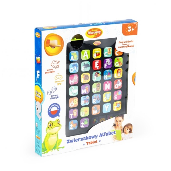 Kolorowe literki, ozdobione obrazkami, kryją w sobie wiele dźwięków! Razem ze zwierzakami, poznaj alfabet, naciskając na poszczególne literki, słuchając ich wymowy oraz wyrazu rozpoczynającego się na daną literę. W tablecie, poza trybem nauki, znajdziemy też tryb gry, w której zadaniem malucha będzie udzielać odpowiedzi na pytania, poprzez naciśnięcie na właściwy obrazek. Zabawka wyposażona została także w wesołe melodie oraz praktyczny przełącznik ON/OFF, umożliwiający wyłączenie tabletu po zakończonej zabawie.