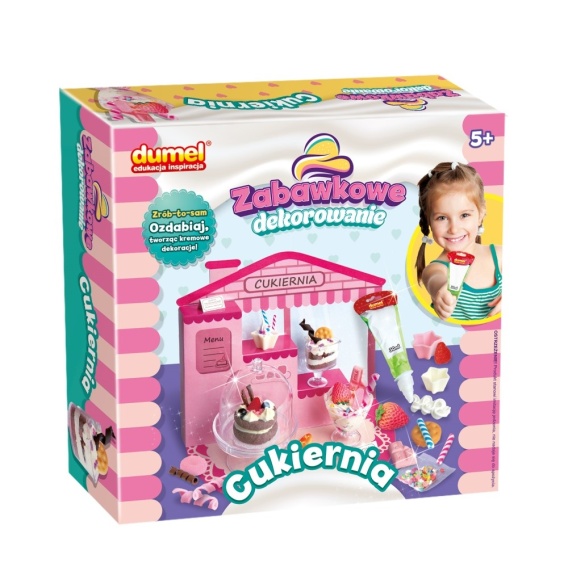 Otwórz własną cukiernię, serwującą zabawkowe desery! Opakowanie zawiera wszystko, czego potrzeba, aby „wyczarować” wiele zabawkowych smakołyków. Poza masą plastyczną, do formowania ciasta, i masą kremową w tubce, do dekorowania, znajdziesz tu też papierową witrynę do wyeksponowania deserów, plastikowe pucharki, paterę oraz wiele kolorowych dodatków, z pomocą których ozdobisz stworzone przez siebie, zabawkowe desery. Po udekorowaniu każdego z nich, pozostaw desery, aby stwardniały, najlepiej na całą dobę.