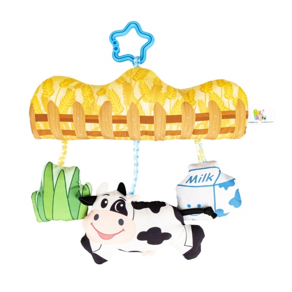 Kolorowa zawieszka, wypełniona dźwiękowymi niespodziankami, zaprasza maluchy na sensoryczną wycieczkę do wiejskiej zagrody! Znajdziemy tu, poza górnym panelem, ozdobionym kłosami pszenicy i płotkiem, krówkę, karton mleka oraz kępkę trawy. Wybrane elementy zabawiają na różne sposoby, dzwoniąc, grzechocząc lub piszcząc. Zabawka wyposażona jest w praktyczną zawieszkę, która pozwala na przymocowanie jej w dowolnym miejscu.